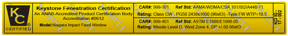 Gold foil NFRC/AWS/Impact permanent certification labels demonstrate certification to building officials and other end-users for compliance with building code and incentive program energy, structural performance, and impact protection requirements. They are typically affixed to window head concealed by a sash in the closed position, most fitting into a channel as narrow as 5/8" wide. NFRC permanent labels must be applied with an accompanying temporary label to be removed by the consumer after final inspection by a building inspection official.